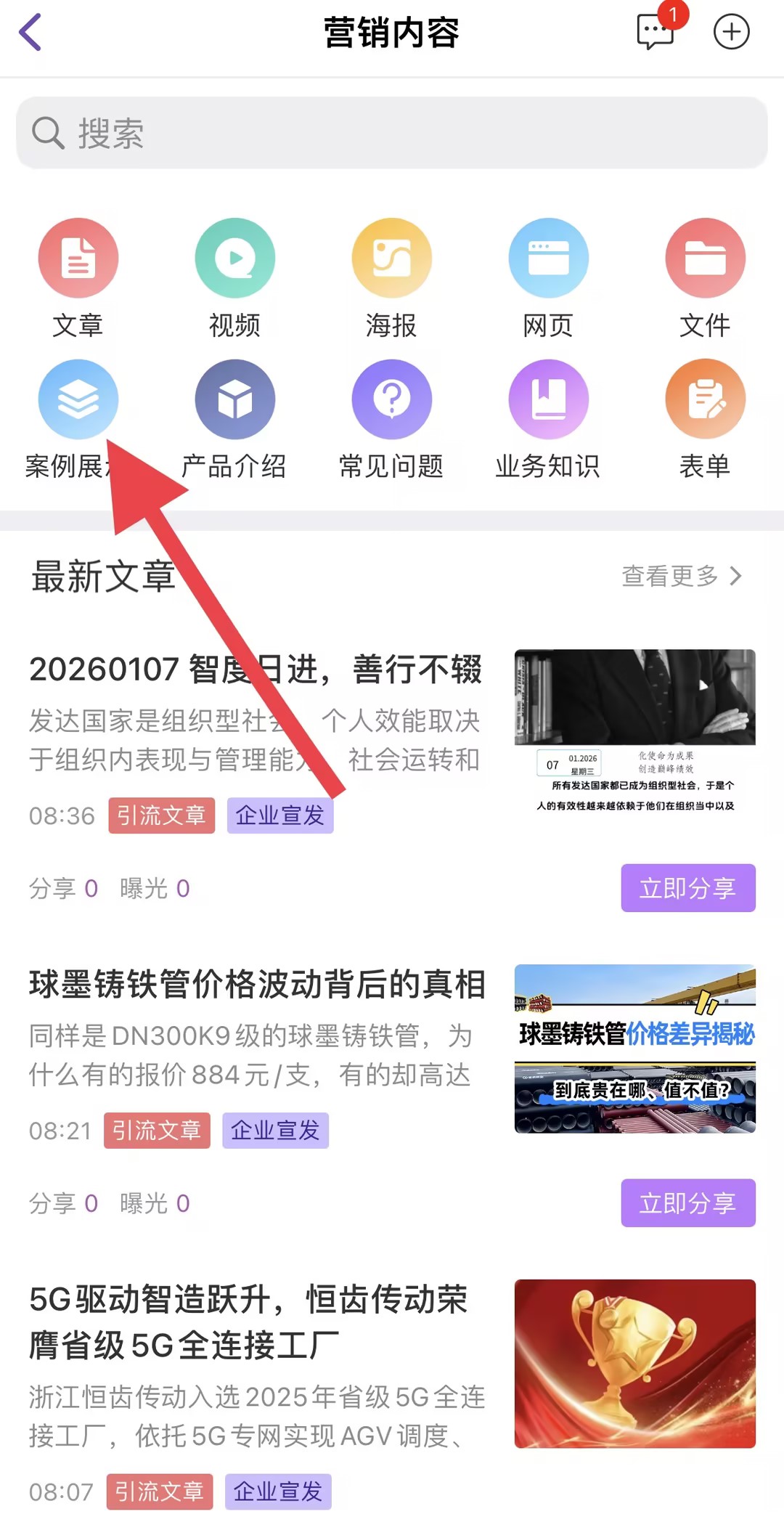 在"营销内容"首页点击"案例展示"图标进入案例库,通过搜索功能输入关键词(如行业、场景)或浏览列表找到相关案例。