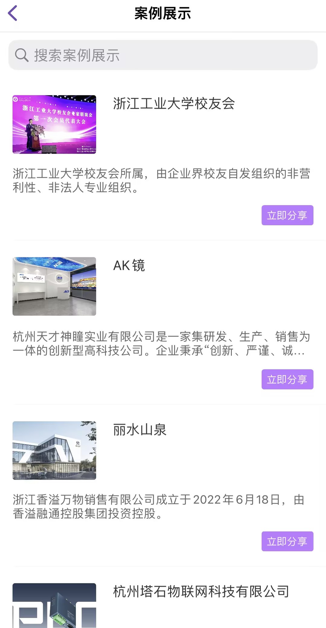 "案例展示"页面以"图片+标题+简述"的卡片形式可视化展示企业客户案例,每张卡片包含高质量场景图、客户名称、行业/业务简述,配备紫色"立即分享"按钮,将成功案例转化为可便捷分发的销售工具和信任状。