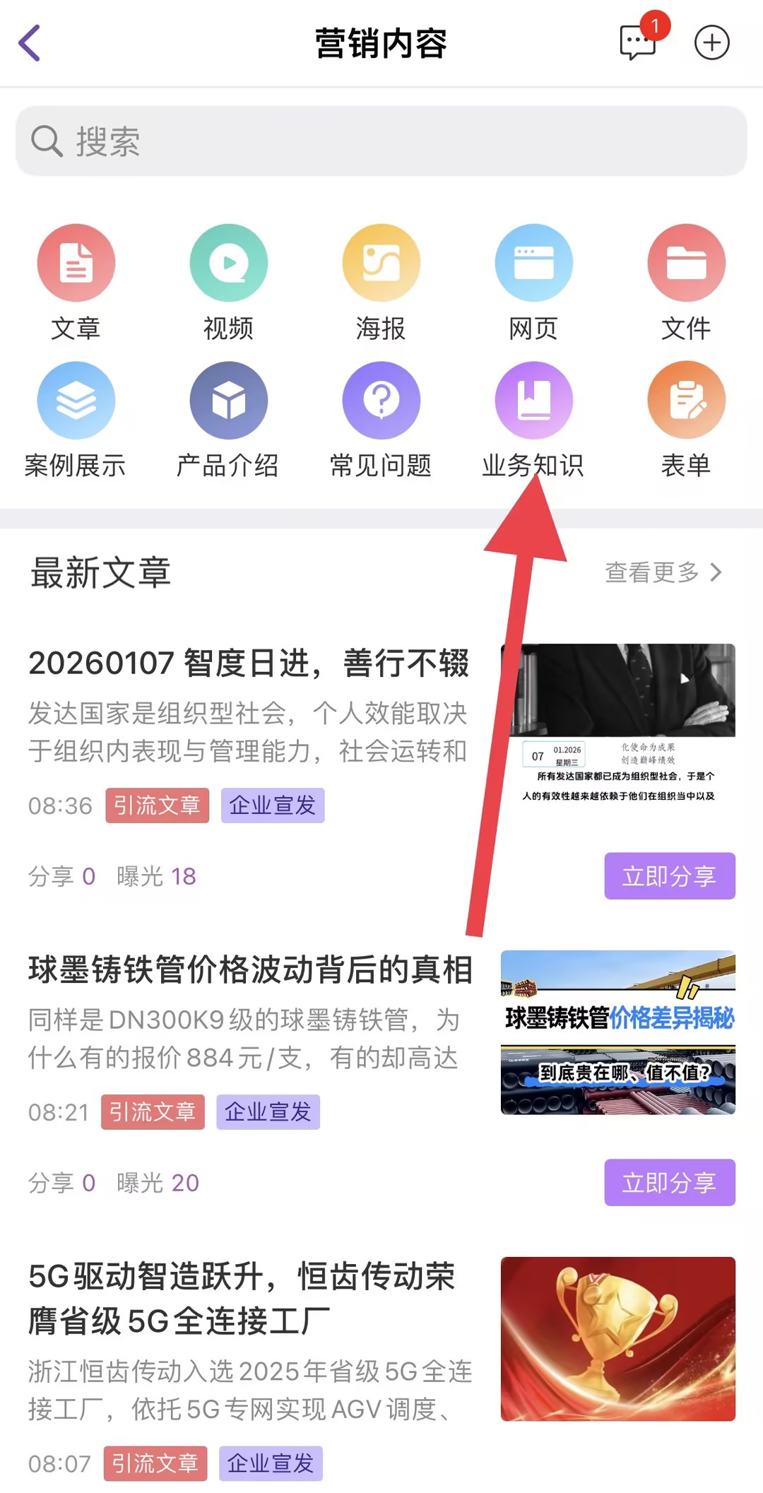 在"营销内容"首页点击"业务知识"图标进入知识库,通过搜索或浏览列表找到相关培训材料。