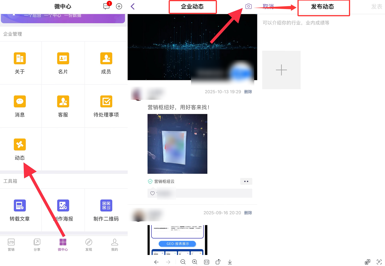 点击"企业动态"页面右上角的紫色"发布动态"按钮,进入内容编辑界面。