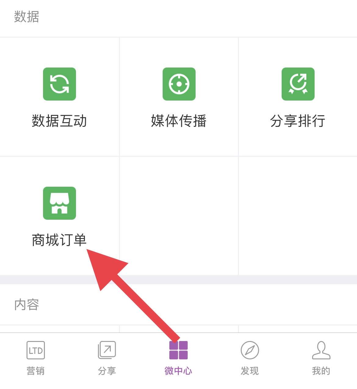 登录后台进入“微中心”,找到并进入“数据”模块,点击“商城订单”图标进入订单管理列表页。