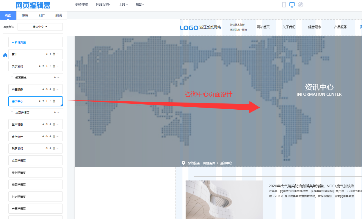 在左侧"页面"树中点击"资讯中心"页面,在右侧文章列表区域新增文章标题、摘要内容,并上传文章封面图。