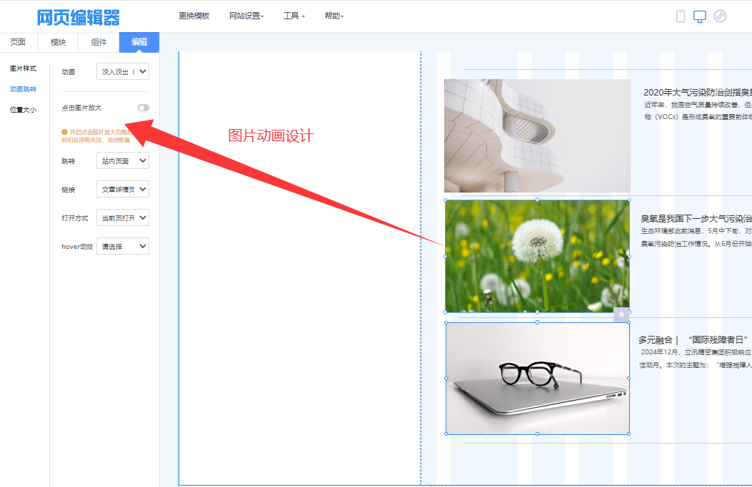 将"图片灯箱"、"淡入动画"、"悬停效果"等需前端开发的效果转化为可视化开关和下拉选项,让运营人员也能轻松实现专业交互。