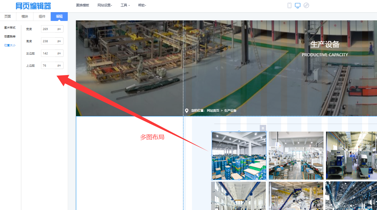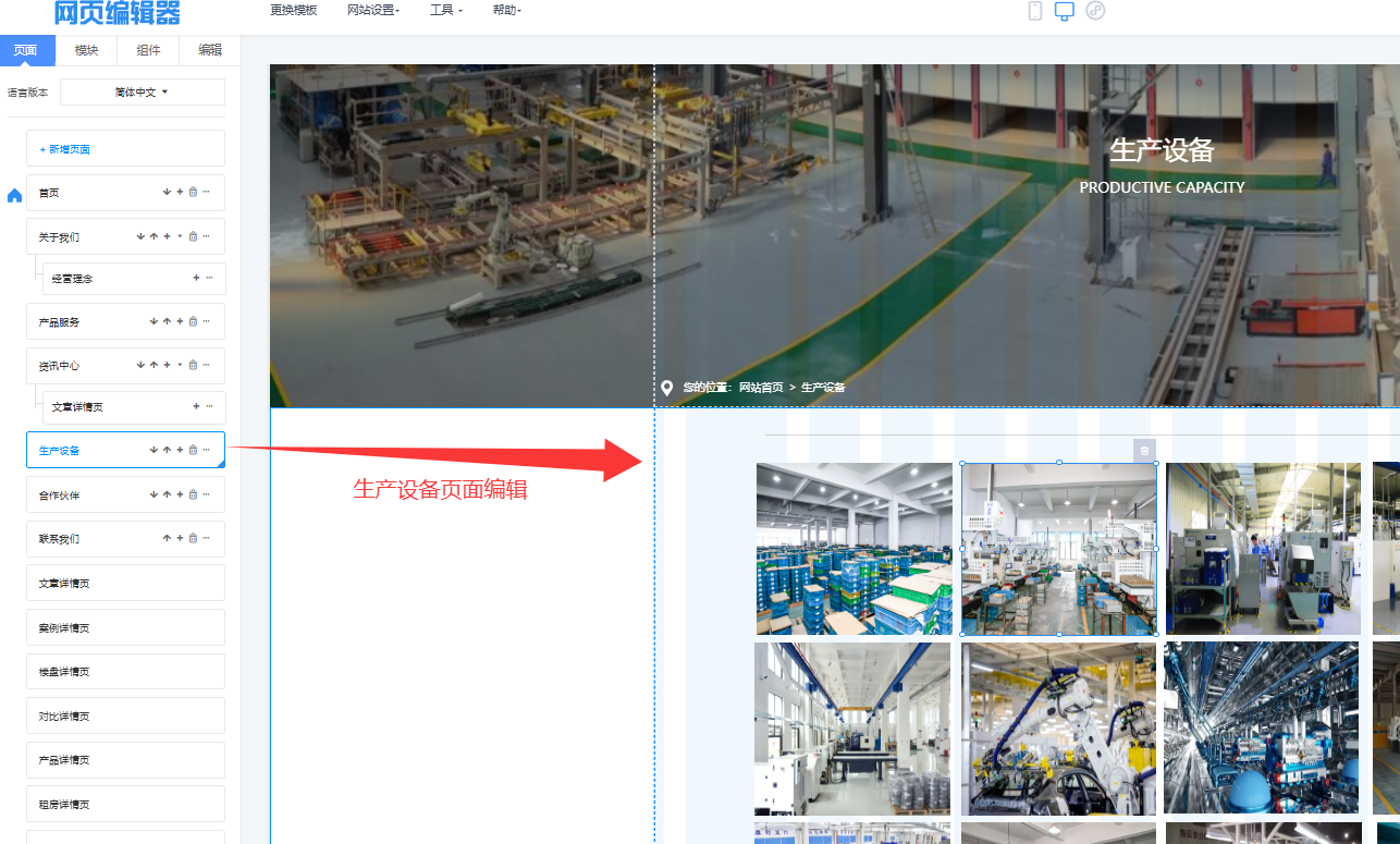 右侧为页面实时预览区,将"生产设备"等页面划分为"主视觉Banner"和"设备图库"等结构化区块。通过"您的位置:网站首页>生产设备"面包屑导航明确编辑上下文,防止在复杂结构中迷失。提供"多图布局"等专用模块,支持网格、瀑布流等格式集中展示多张图片。