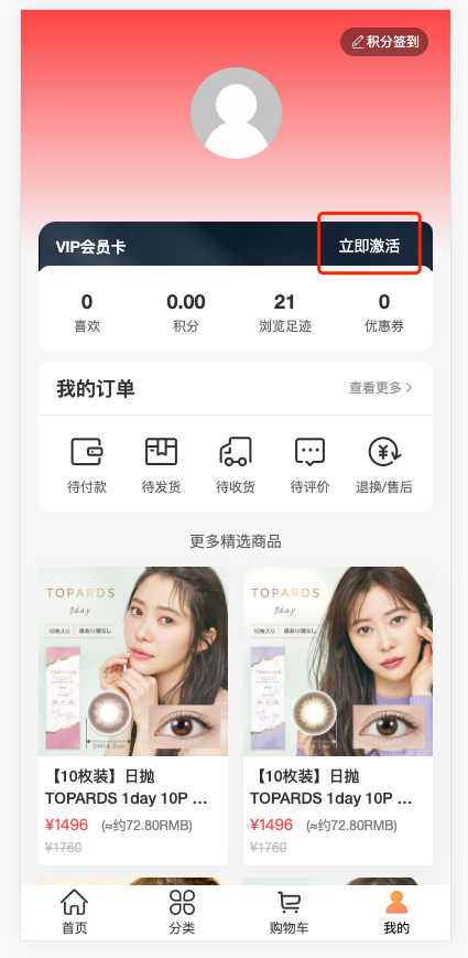 用户在前端「我的」页面可查看VIP会员卡权益,并通过「余额充值」入口参与充值活动。