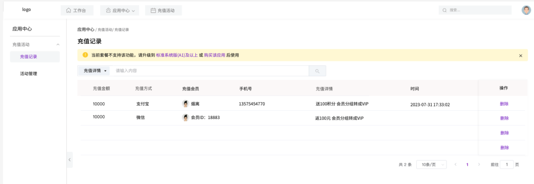 完整的充值记录追踪功能,可清晰查看每笔充值详情,便于商家进行会员分析和营销效果评估。