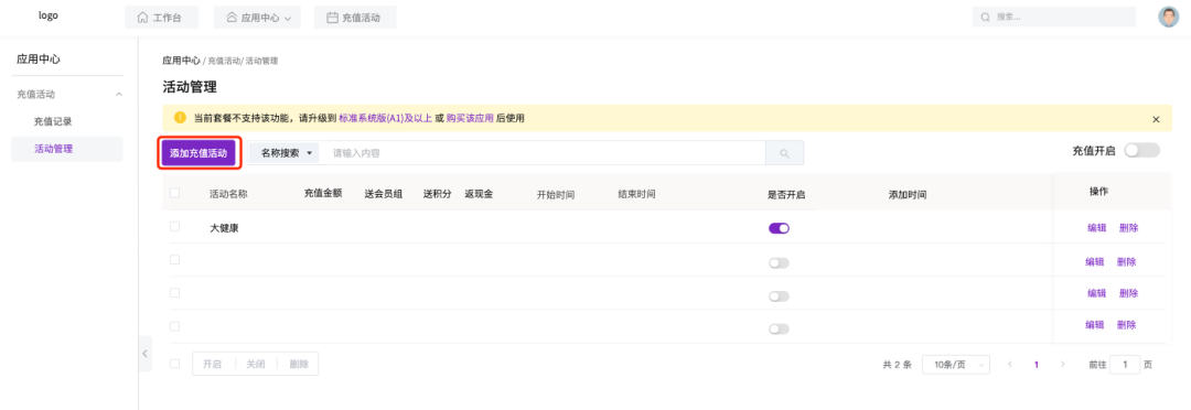在活动管理列表中找到创建的活动,将「充值开启」开关切换到开启状态。