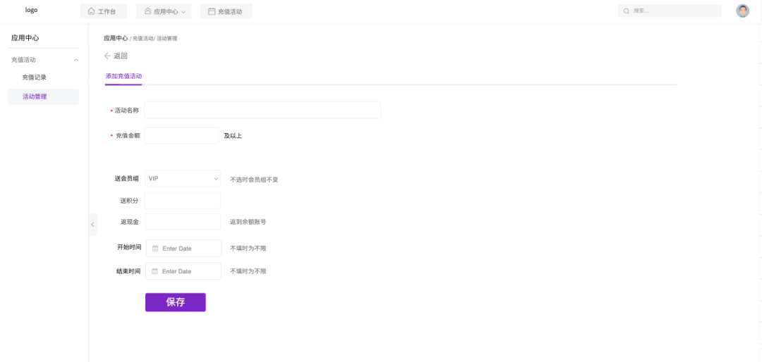 点击「添加充值活动」按钮,进入活动配置页面。