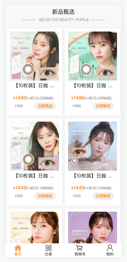 商城前端商品列表页,每个商品价格处同时显示原币种价格(如1496日元)和换算后的目标货币价格(如约73.03RMB)。