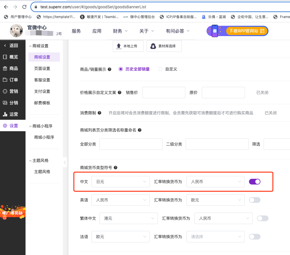 官微中心商城设置页面,在“商城货币类型符号”区域,可为不同语言版本设置基础货币和汇率转换货币,并通过右侧开关控制功能启停。