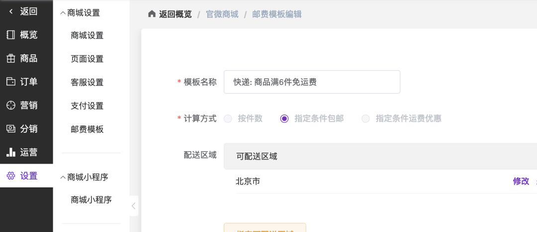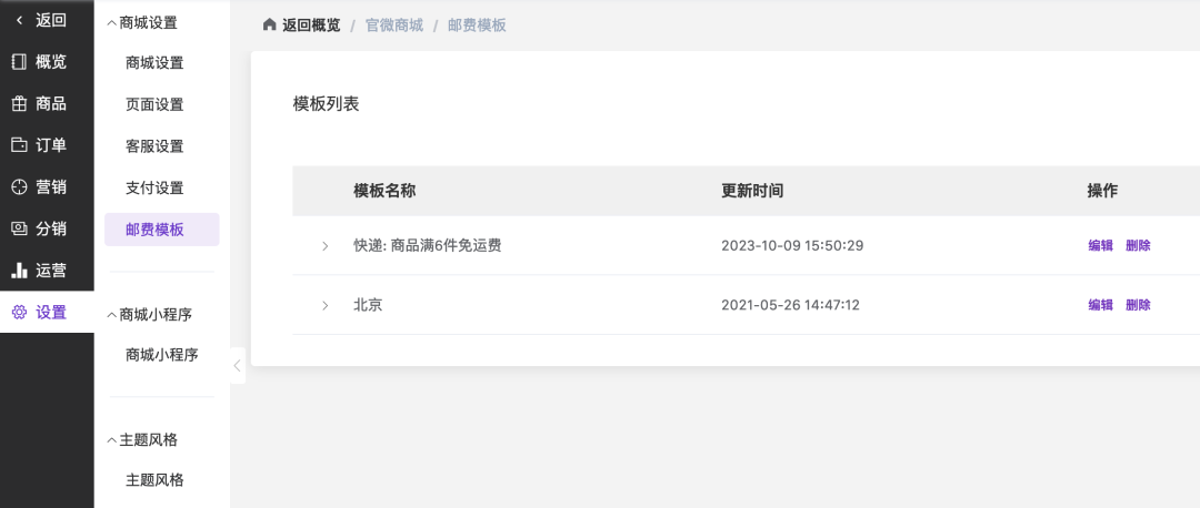 登录官微中心,依次点击「商城」-「设置」-「商城设置」-「邮费模板」,进入模板管理页面。