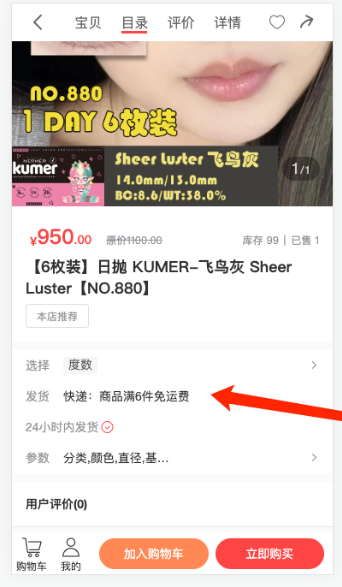 商品详情页中,发货信息区域直接显示邮费模板名称“快递: 商品满6件免运费”,同时展示发货时效“24小时内发货”。