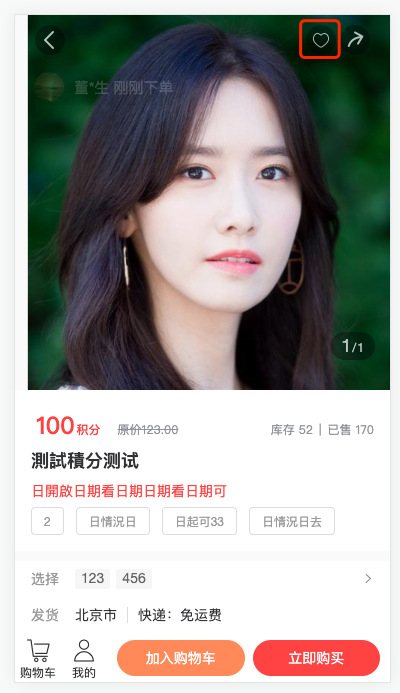 商品详情页右上角红框内为心形收藏按钮,用户可点击进行收藏/取消收藏操作。页面同时展示商品图片(如林允儿半身照)、价格信息(100积分/原价123.00)、库存销量(库存52/已售170)及操作按钮(加入购物车/立即购买)。