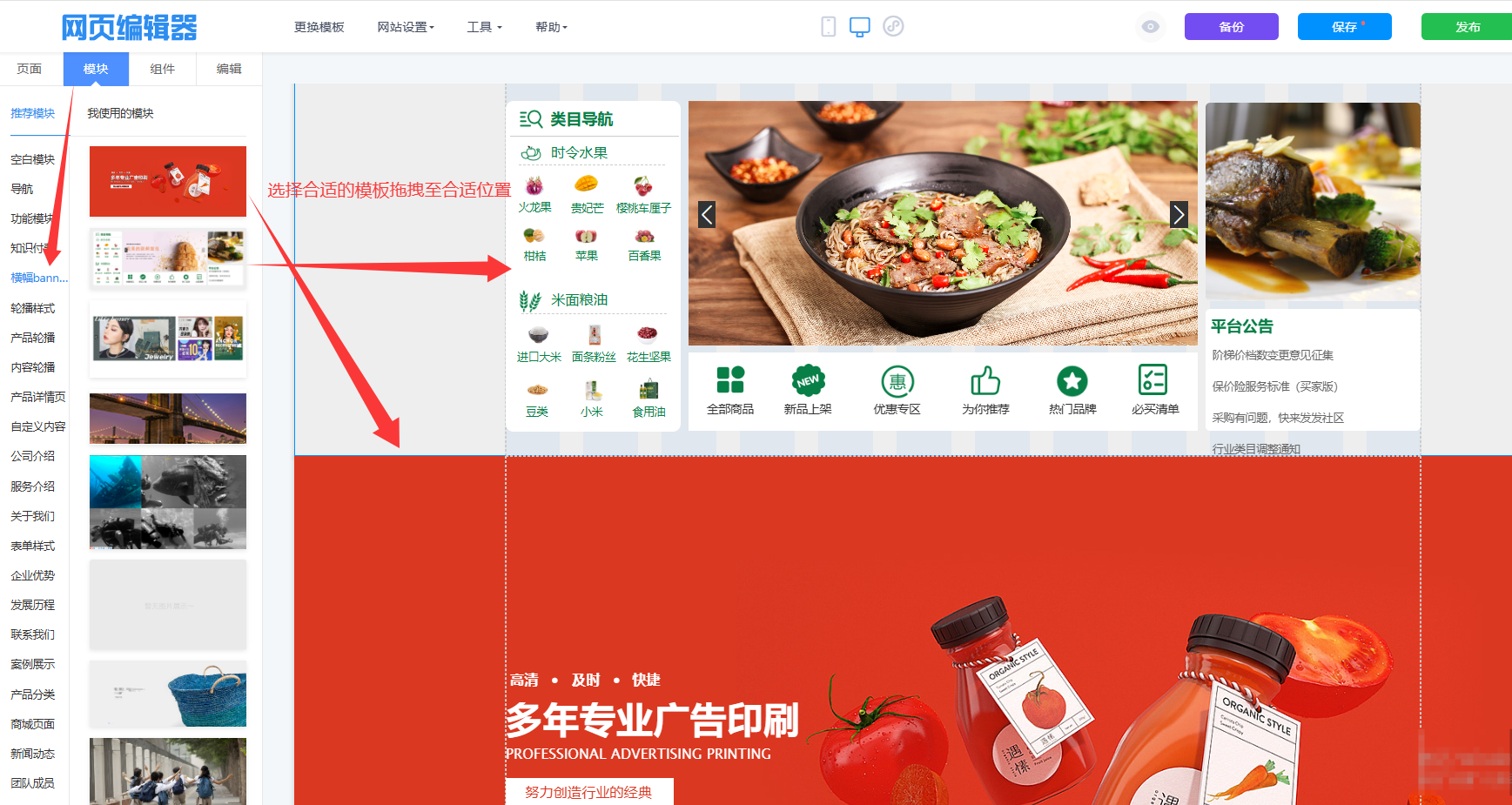 进入首页编辑,在"模块"选项卡下浏览"推荐模块"。依次拖拽"导航"模块到页面顶部、"横幅banner"模块到导航下方、"产品分类"模块展示类目导航、"商城页面"模块展示商品列表。