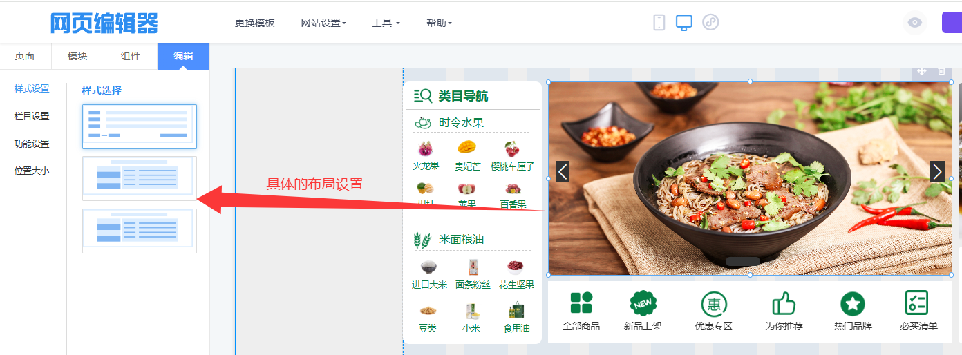 点击选中商品分类模块,左侧切换到"编辑"面板。在"样式设置"或"具体布局设置"中调整模块的内部间距、排列方式(如一行显示4个还是5个类目)。