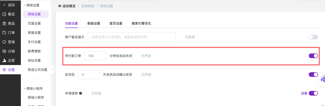 商城设置-功能设置页面,“待付款订单”配置项包含时间输入框(默认130分钟)和开启/关闭开关,红框内为功能控制区域。