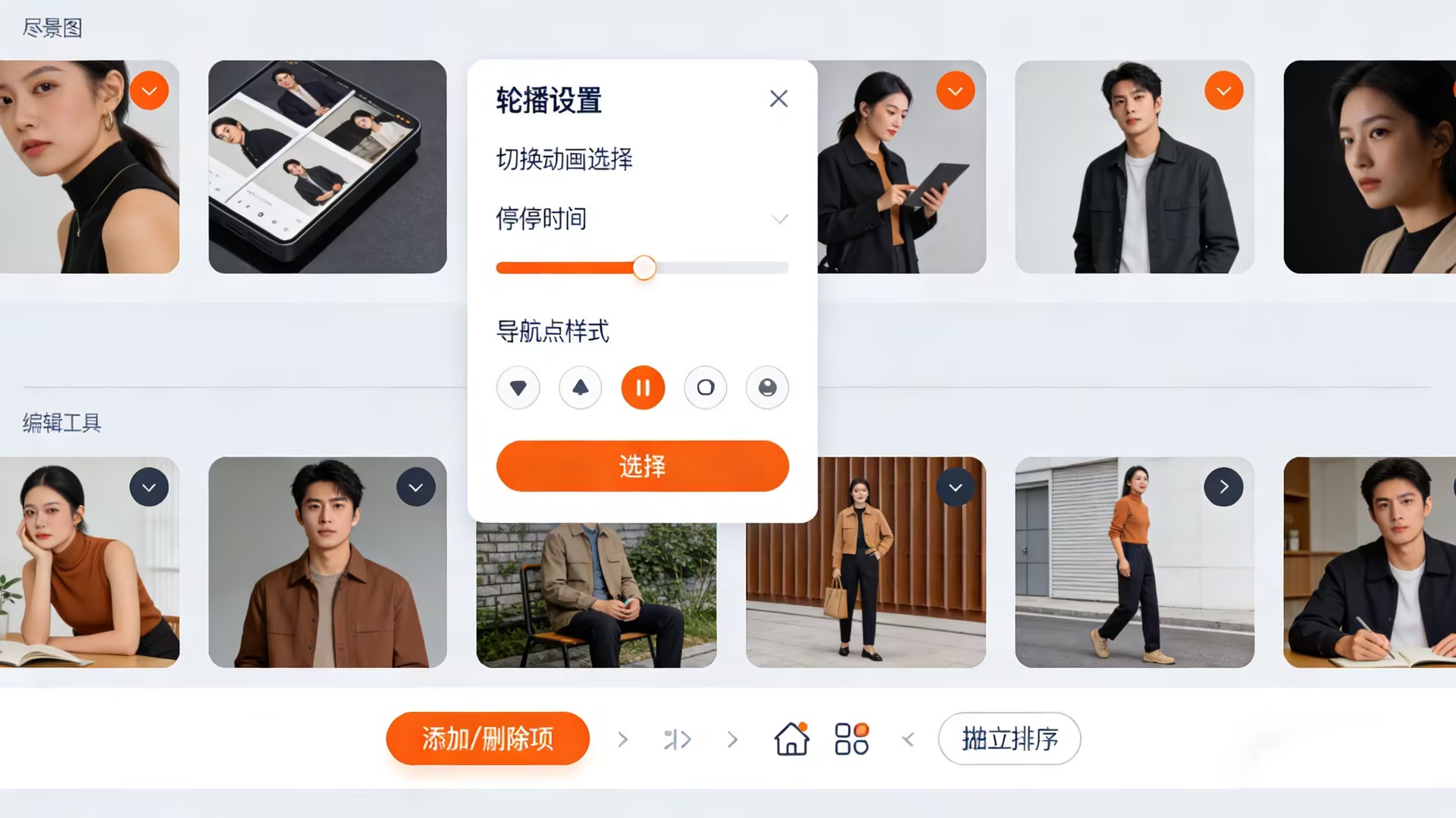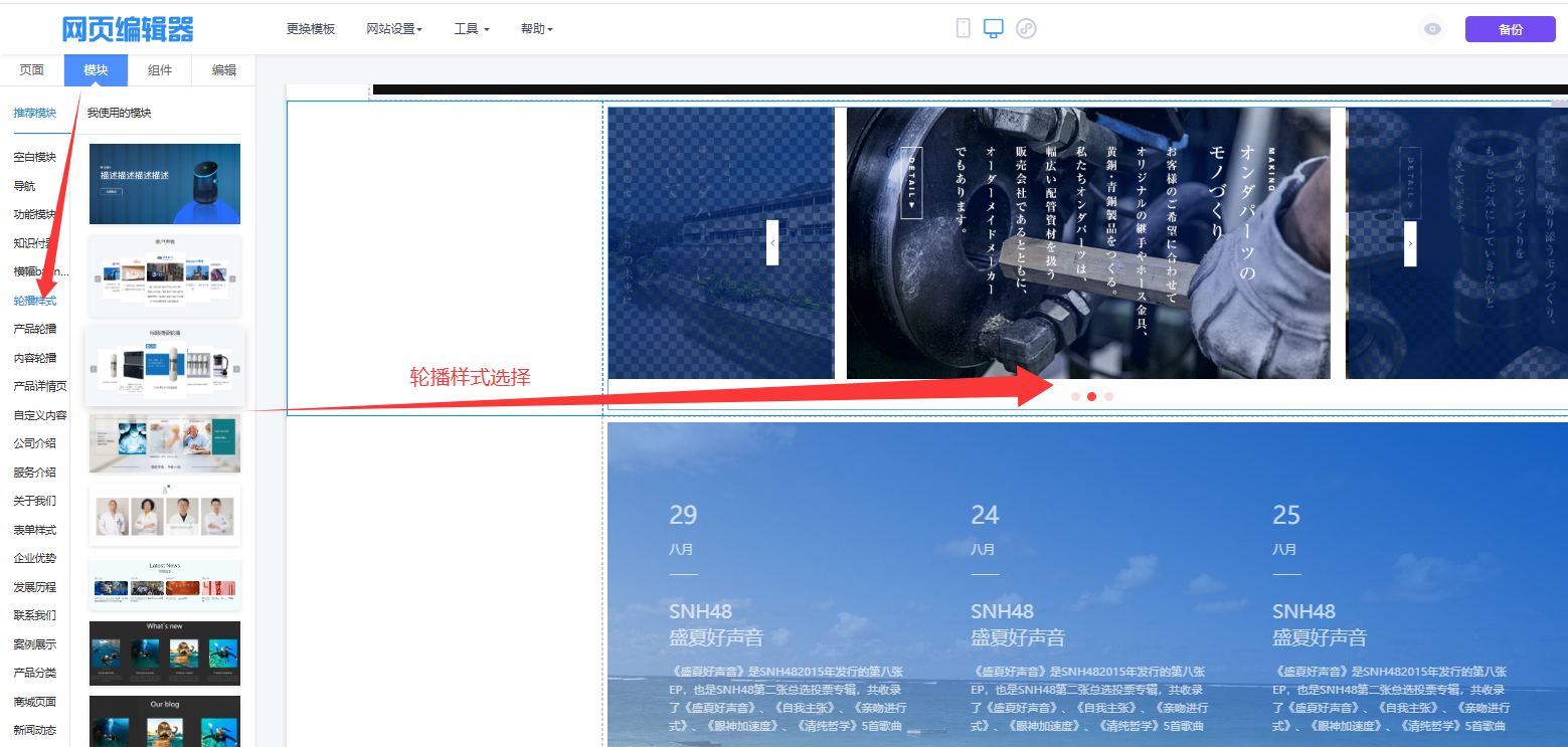 图示:面向非技术用户(运营、市场、编辑)的“高速模式”。此界面通过拖拽预制模块、直接点击编辑内容的方式,高效完成日常内容更新、页面搭建和基础样式调整。图中以“轮播样式”模块为例,红色箭头突出显示模块选择,用户可直观地替换图片、修改文案,满足80%以上的常规建站与维护需求。