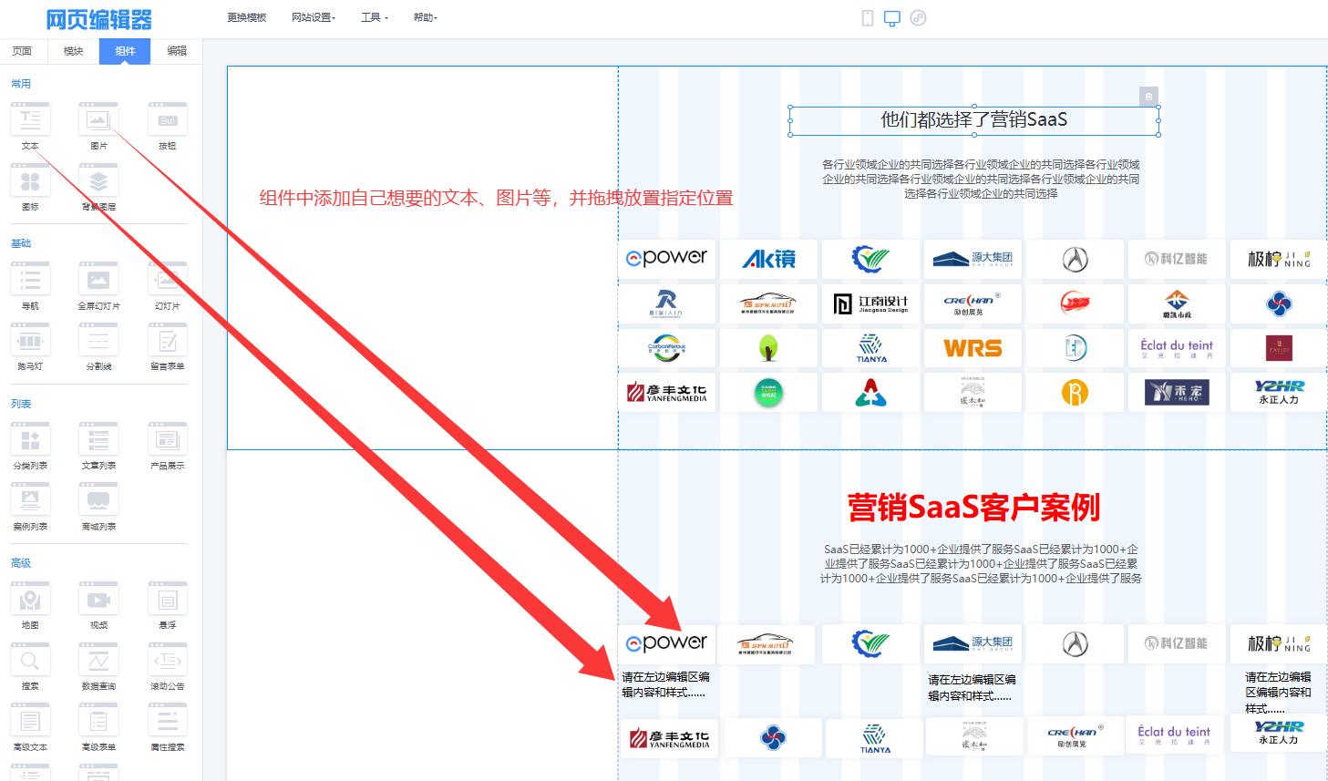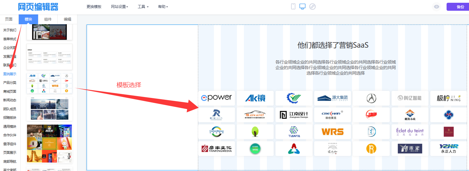 进入编辑器,在目标页面(如“客户案例”页)的“模块”库中找到“案例展示”模块,将其拖拽到页面中。系统会自动生成包含标题区、品牌Logo矩阵区和数据统计区的完整框架。修改主标题为“信任我们的合作伙伴”,副标题为“众多行业领导者共同的选择”。