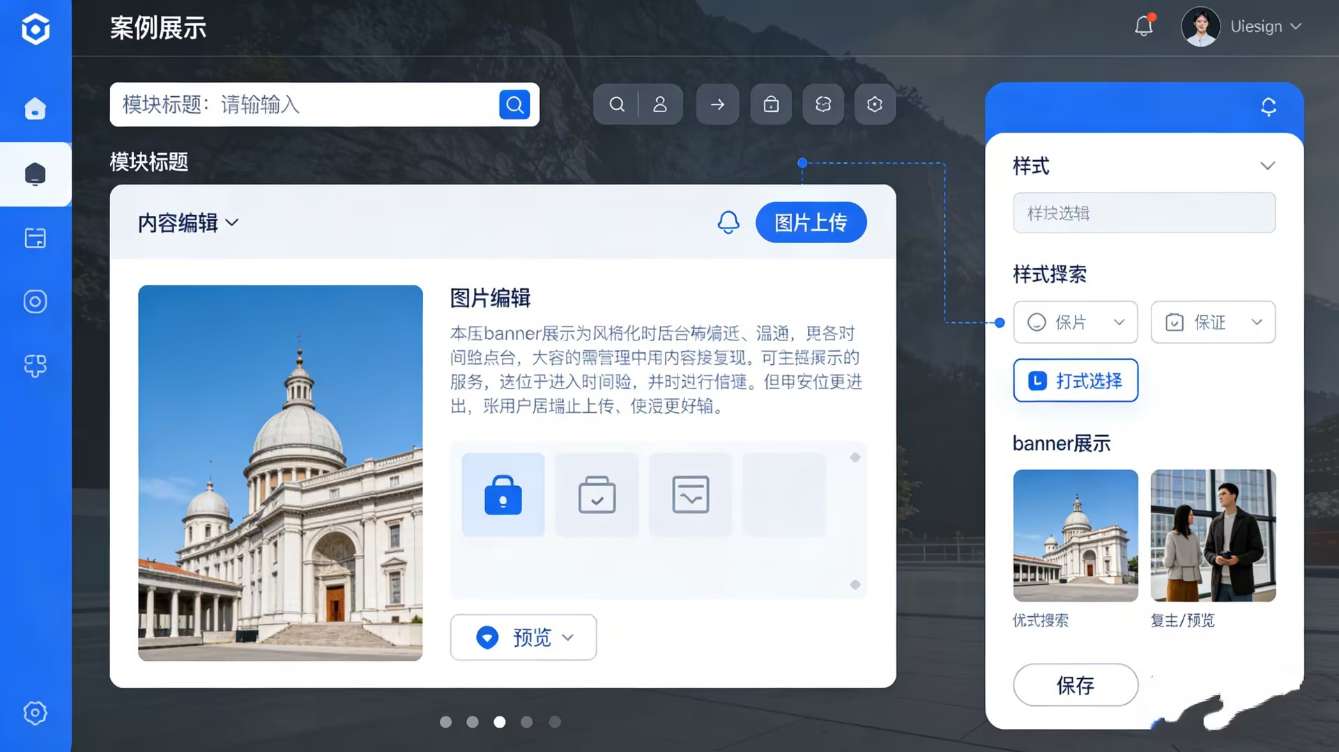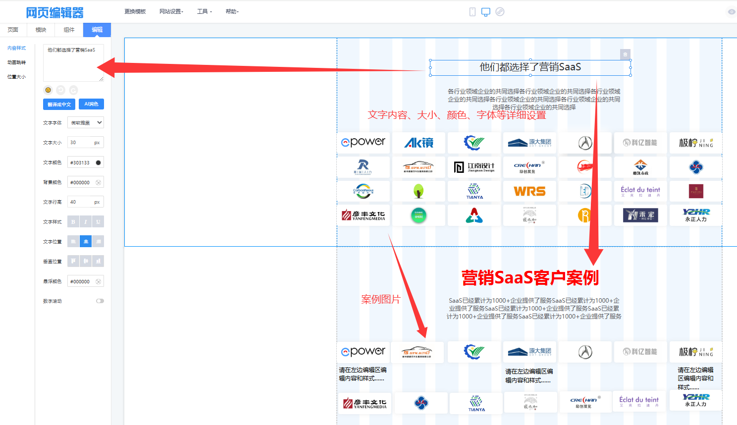 图示:样式深度定制视图。左侧“内容样式”面板提供了对标题、文案等文字元素的字体、大小、颜色、样式的完整控制。右侧是实时预览。图中的“请在左边编辑区编辑内容和样式...”指引用户进行直观修改。此阶段允许用户在不改动布局的前提下,对案例展示的视觉细节进行精细打磨,确保品牌统一。