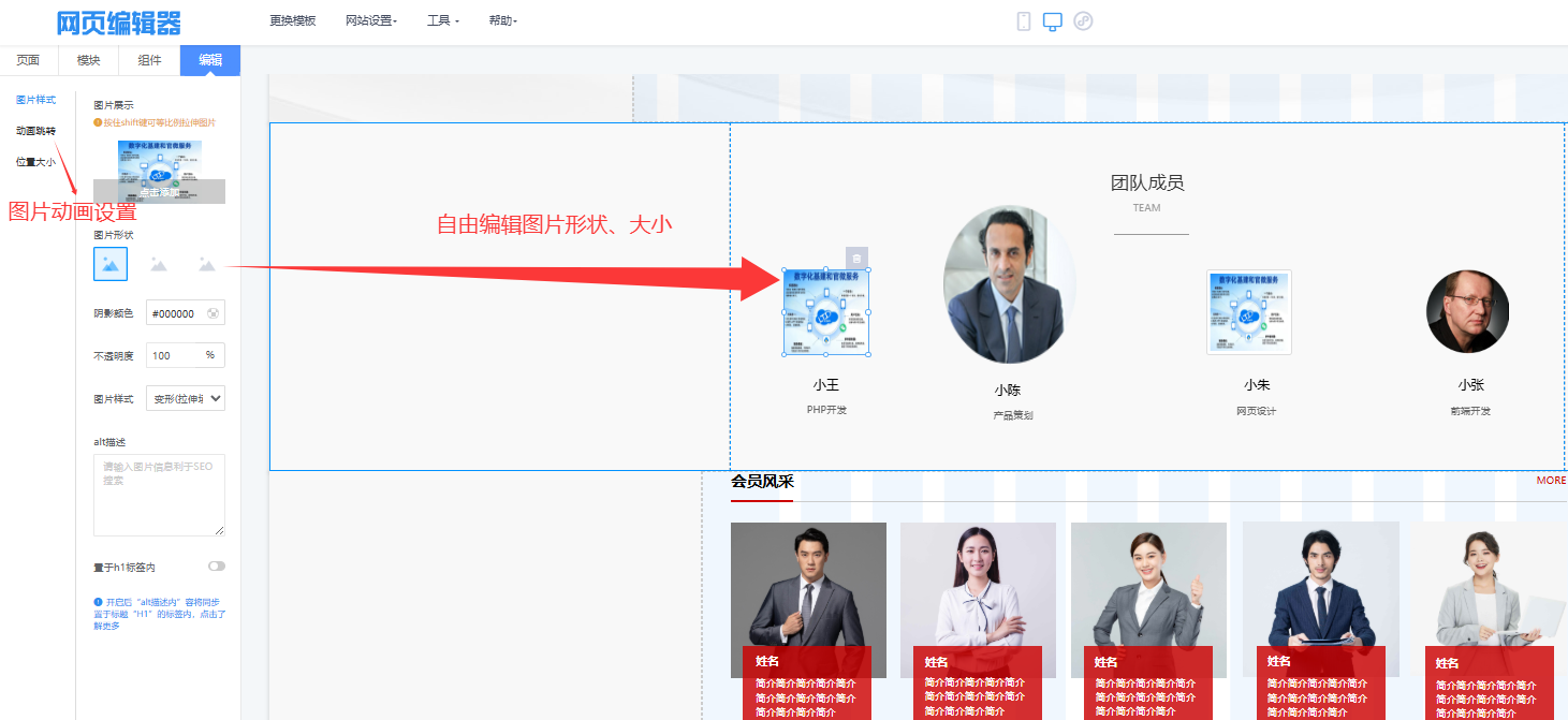 在“编辑”模式下,提供强大的“图片样式”面板,可对人物头像/照片进行深度美化,包括调整形状(圆形、圆角)、阴影、不透明度,以及进行等比例拉伸变形。更重要的是,面板内置SEO优化功能,可直接为每张图片添加“alt描述”文本和设置“H1标签”,无需额外工具或代码,即可提升网站可访问性和搜索引擎友好度。