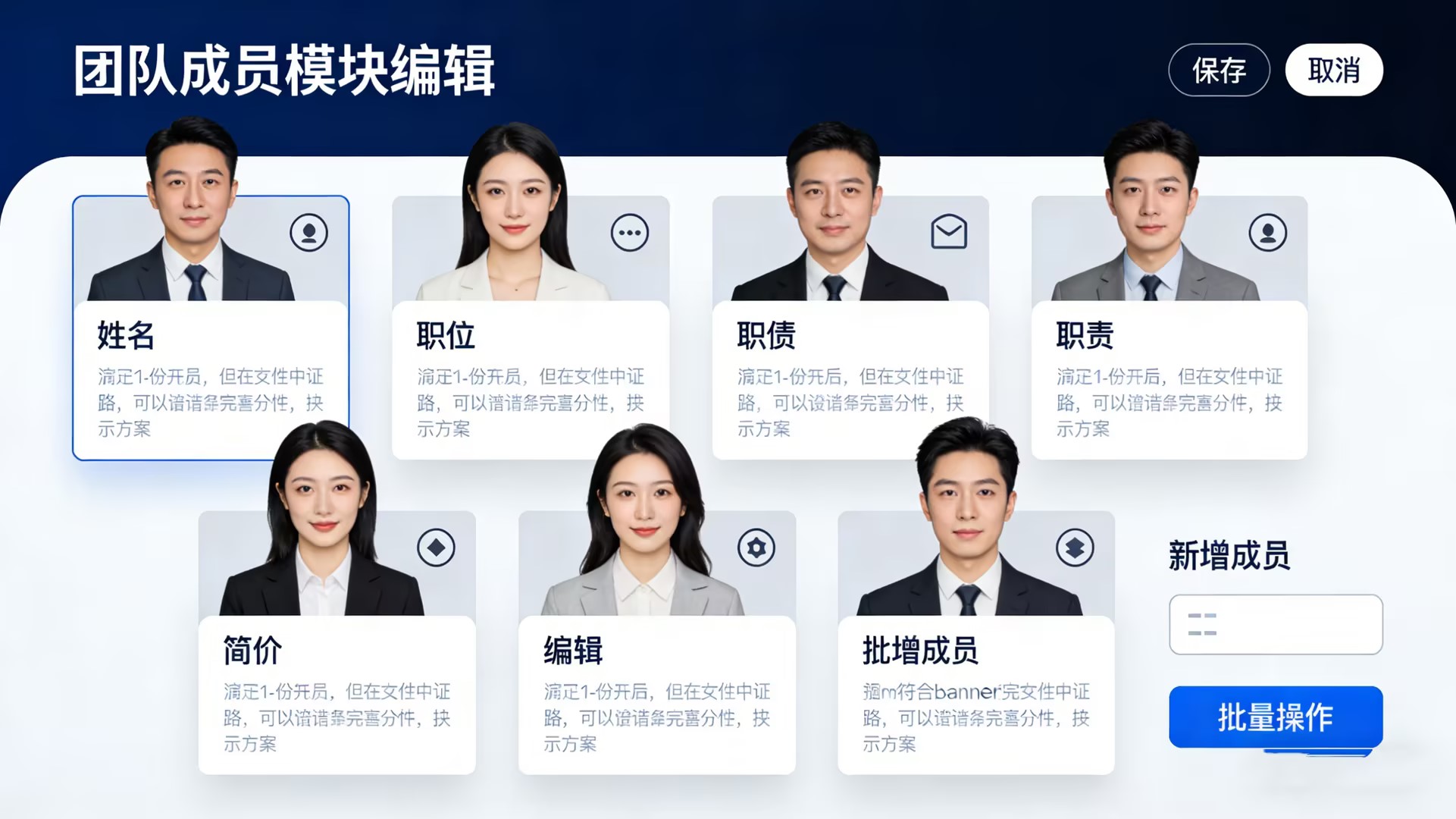 企业官网与服务机构 用于“关于我们-团队介绍”页面,展示创始人、管理层及核心团队成员,树立专业、可信赖的品牌形象。律师事务所、咨询公司可用其展示专家团队资历。 通过标准化、美观的人物展示,快速建立客户信任,将抽象的“公司实力”转化为具体、可感知的“人才实力”。