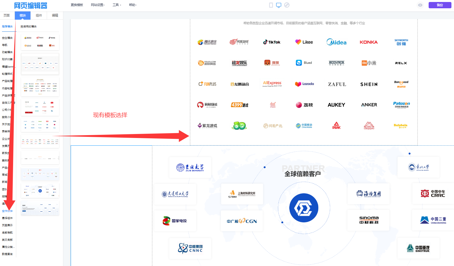 系统提供包含“现有模板选择”功能的丰富模板库,支持用户快速启动专业网站。其核心亮点之一是预制“全球信赖客户”展示模块,内置大连理工大学、国家电投、中航集团、CNNC等知名机构的高质量Logo。企业可直接使用或替换为自己的客户Logo,快速构建强有力的行业信任背书,传递“帮助各类型企业迅速开拓市场”的品牌实力。