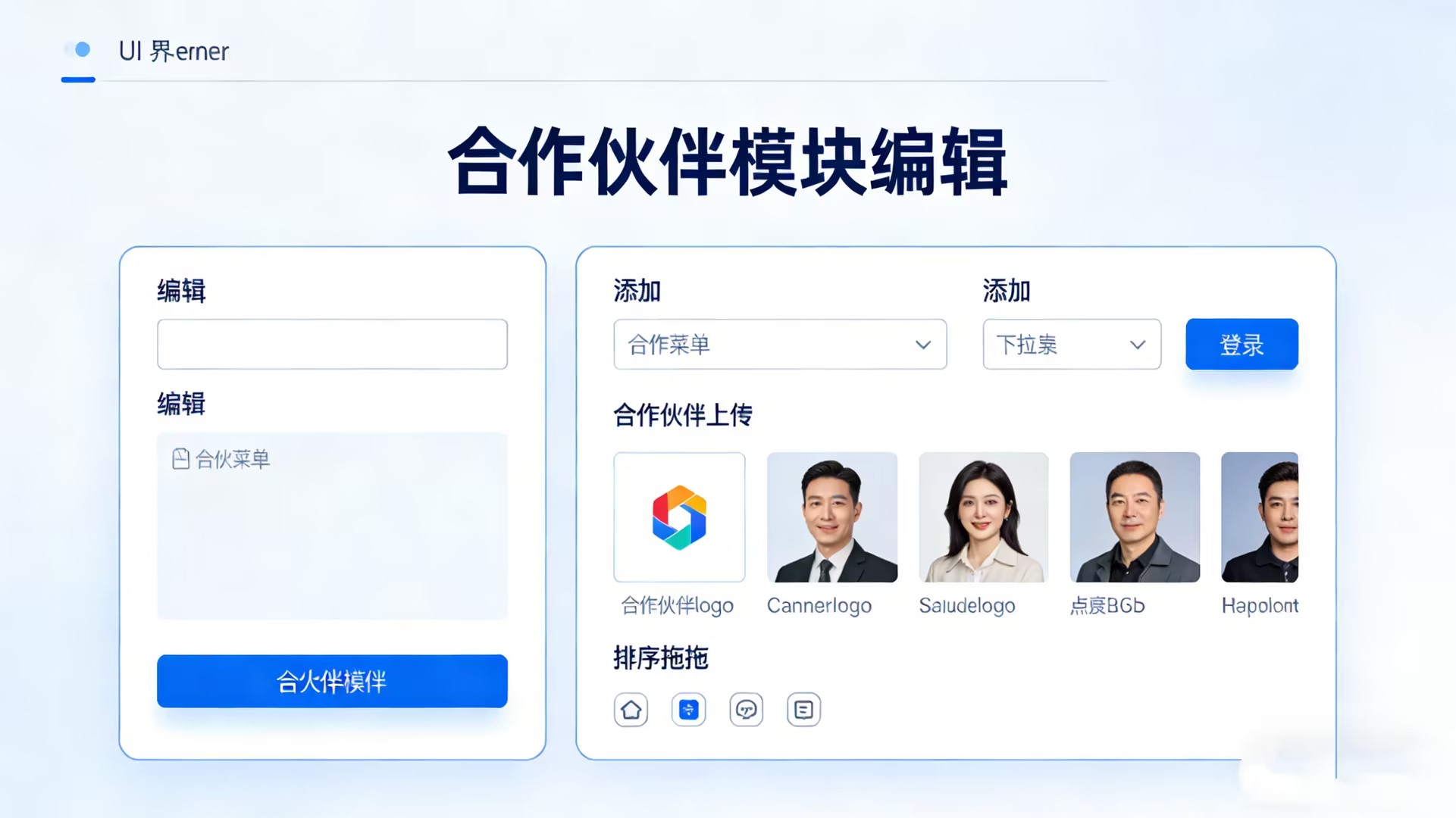 在官网的“关于我们”或“成功案例”页面,从“模块”库中找到“全球信赖客户”或“合作伙伴”模块,拖拽到页面中。该模块会自动生成一个包含多个知名机构Logo占位符的展示区域,为页面奠定专业、可信的视觉基调。