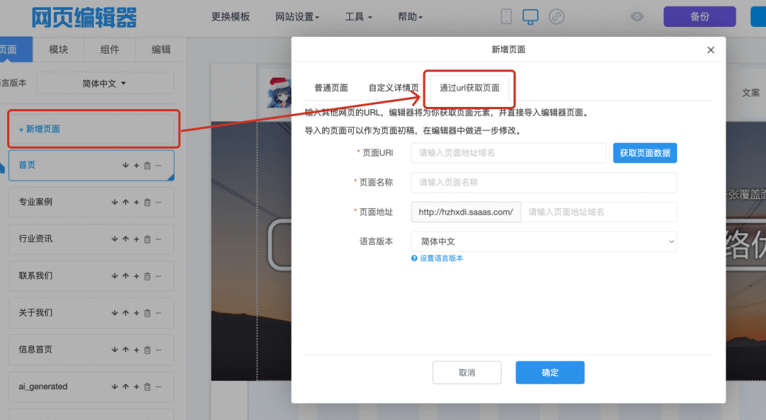 在弹出的新增页面窗口中,点击顶部的「通过url获取页面」选项卡。