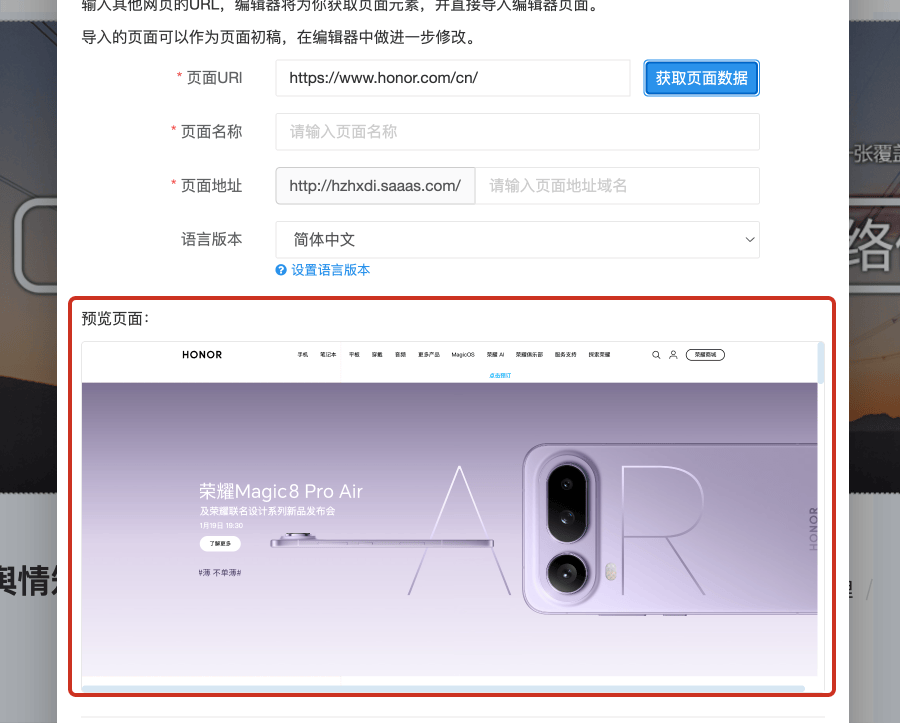 抓取成功后,弹窗下方红框内的“预览页面”区域会显示转换后的页面内容,例如可以看到荣耀官网的布局与元素。