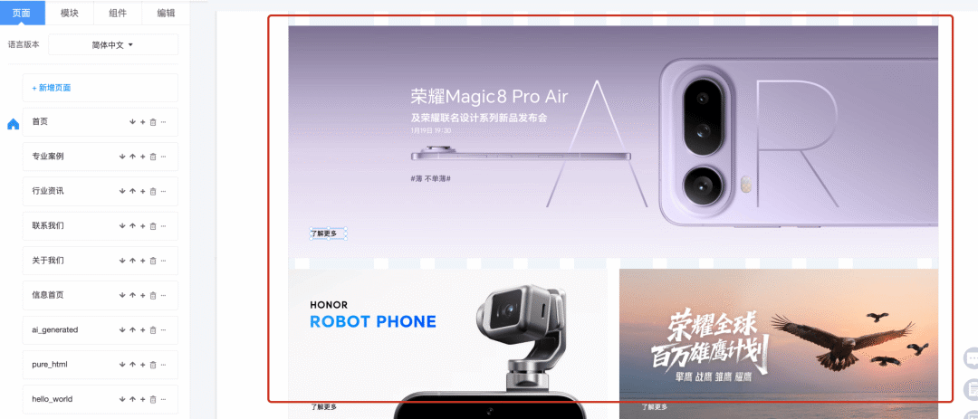 页面创建成功后,在编辑器中打开,可以看到抓取转换后的模块和组件,用户可在此进行自由编辑和设计。