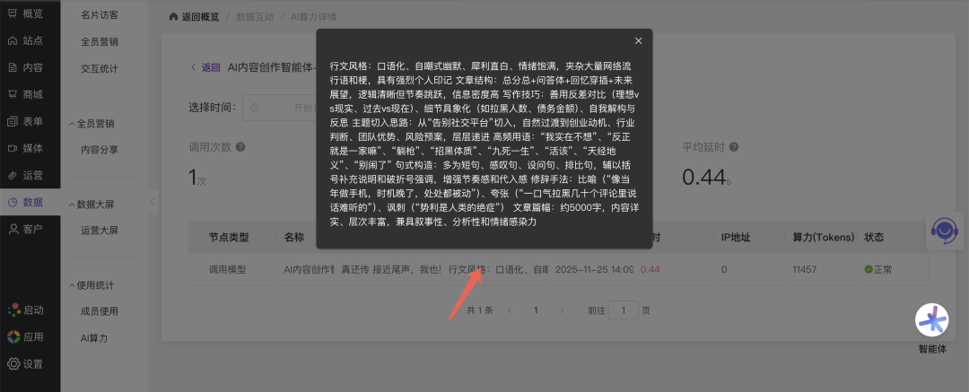 企业级AI内容生产的“中央驾驶舱”: 此界面是企业进行规模化、结构化AI内容创作的核心工作台。整体采用清晰的三栏式布局,逻辑分明。左侧导航栏(功能模块) 定义了从“站点”到“评估反馈”的全流程营销闭环,明确了内容创作在业务中的位置。中部核心创作区(智能体配置与输出) 是功能核心,黑色信息框内清晰定义了当前AI智能体的“人设”与指令(如口语化、善用反差对比、擅长1:1咨询回复),并展示生成的“话术”和“结构化数据”,实现了从意图到内容的直接转换。右侧历史记录区(创作资产) 则保存了每次创作的过程与结果,包括使用的模型、时间和消耗,形成了可追溯、可复用的内容资产库。顶部导航路径(返回:内容营销/全渠道推广等)则表明本功能深度嵌入在更宏观的业务工作流中。