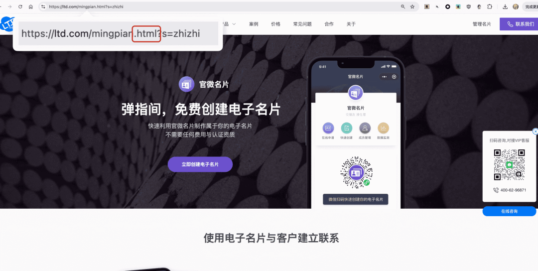 示例页面展示了如何通过带“.html”后缀的URL(如 /mingpian.html)访问原本的落地页,说明了伪静态化后的实际效果。