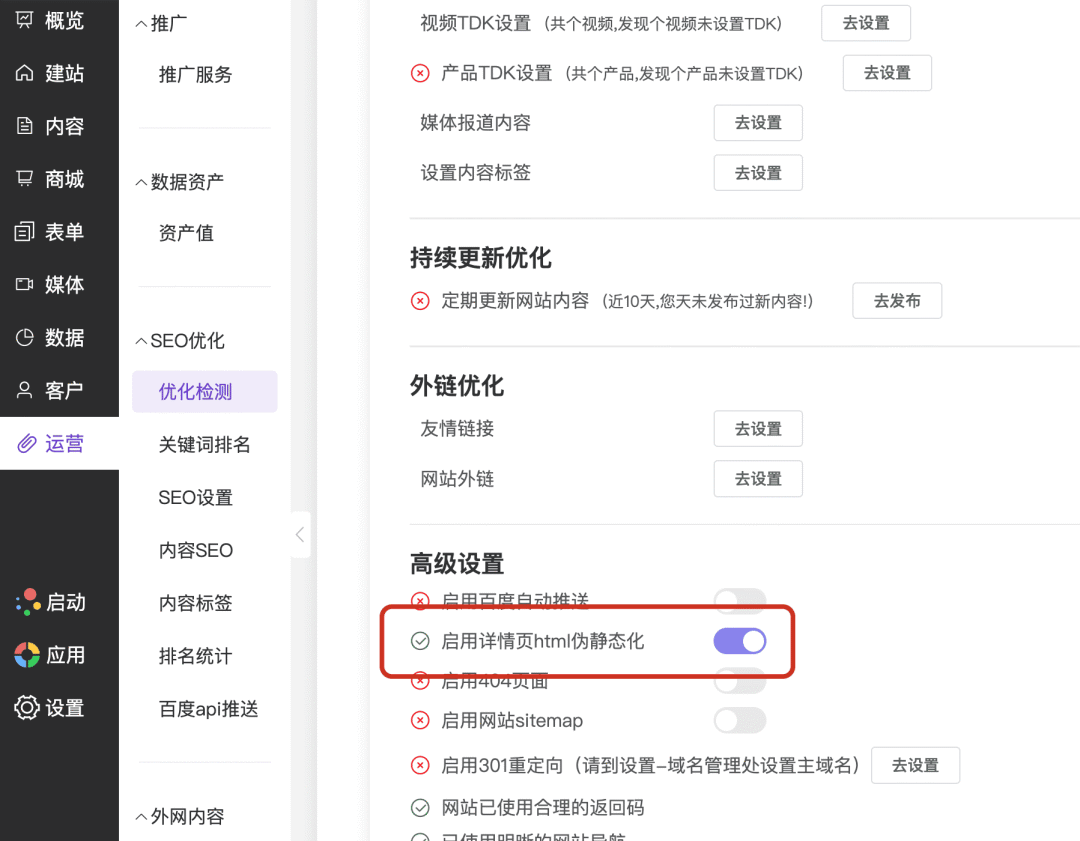 在官微中心后台,依次进入「运营」-「SEO优化」-「优化检测」,可在“高级设置”板块找到并开启“启用详情页html伪静态化”功能(图中红框位置)。