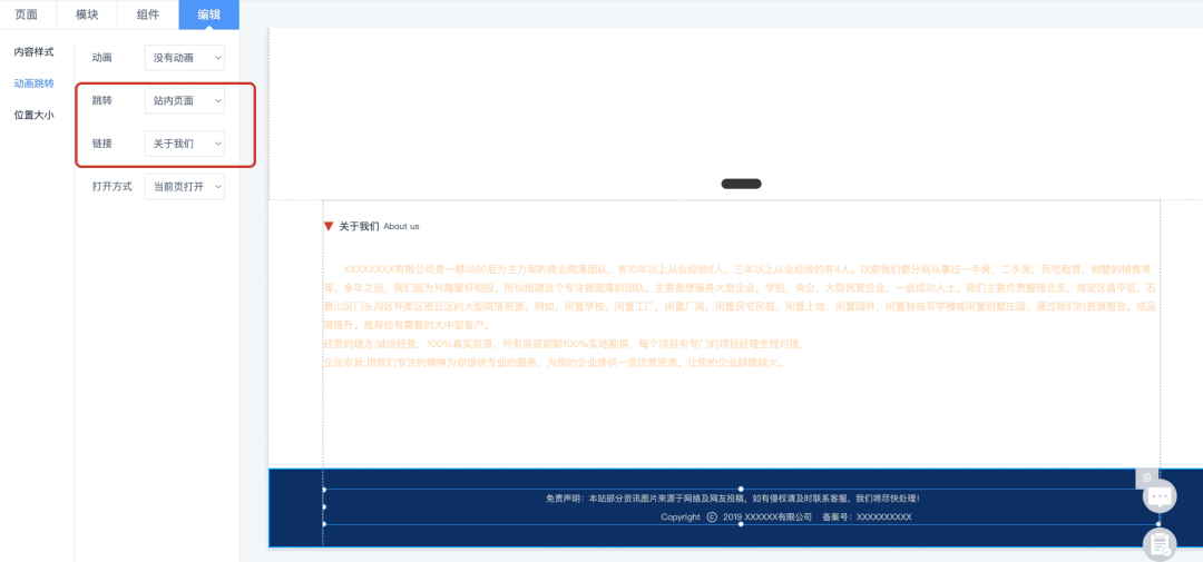 在网站编辑器中,当为内容(如按钮)设置跳转到“站内页面”(如“关于我们”)时,开启伪静态化后,该链接会自动转换为带“.html”后缀的静态链接。