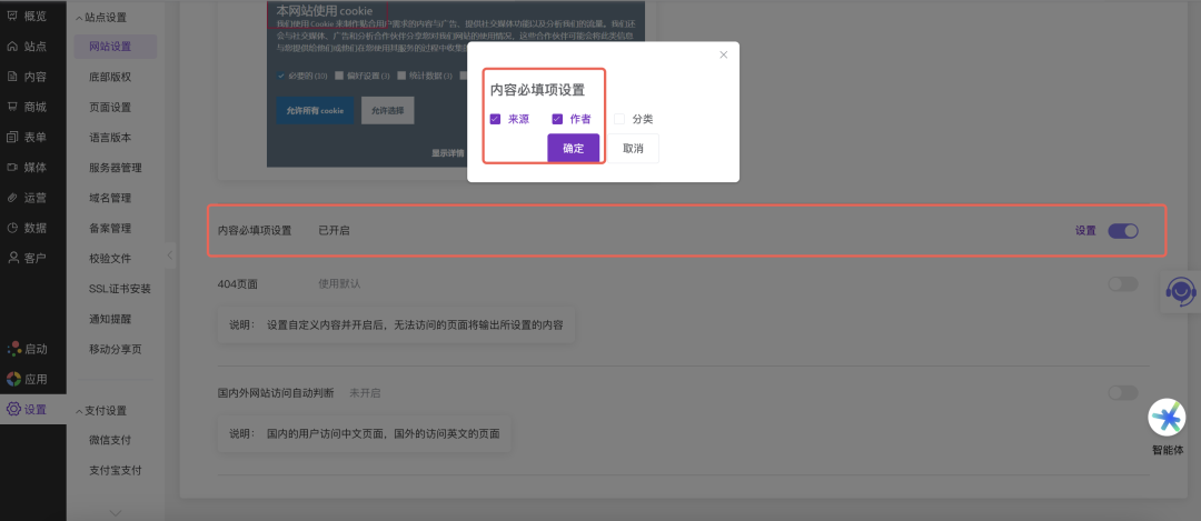 站点级内容规范的“总开关”: 此截图展示了“设置”-“站点设置”-“网站设置”页面中的一个功能模块。在页面靠下的位置,有“内容必填项设置 已开启”的标识,旁边是紫色的“设置”按钮。点击“设置”按钮后,会弹出如红色方框所示的“内容必填项设置”弹窗。弹窗内有三个可勾选的选项:“来源”、“作者”、“分类”。管理员可以根据运营需求,勾选一个或多个字段,将其设置为全站范围内的必填项。弹窗下方是“取消”和“设置”按钮,用于关闭弹窗或保存更改。此界面是管理员集中定义全站内容发布规范的决策中心。