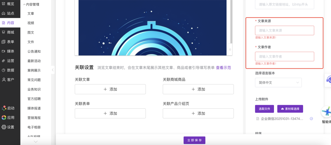 内容生产端的“强制”规范执行界面: 此截图展示了用户在后台创建或编辑一篇“文章”时的界面。界面左侧为菜单导航栏,右侧为内容编辑主区域。在主区域靠上的位置,有两个输入框被红色方框醒目地高亮标出,分别是“*文章来源”和“文章作者”。它们的红色边框表明,由于后台已将此二字段设置为必填,而当前用户尚未填写,系统正在进行实时校验并给予错误状态提示。用户必须在此处输入相应信息,否则无法成功保存内容。图中还显示了“选择语言版本”、“上传附件”等其他可选功能,但红色边框精准聚焦于必填项,强制用户必须完善这些信息。这个界面直观地体现了后台设置如何在前台编辑环节生效,从而保证内容信息的完整性。
