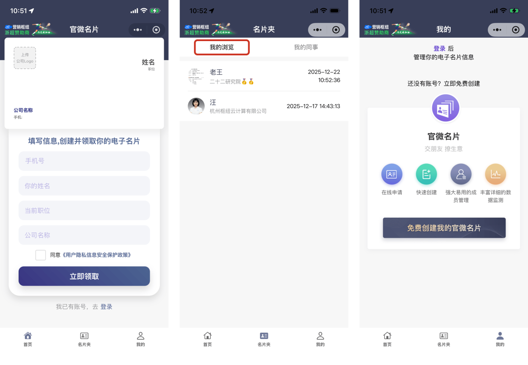 无需登录的历史记录中心: 此截图展示了“名片夹”标签页。页面顶部标题为“我的浏览 我的同事”,表明此页兼具“我浏览过的”和“我的同事”两大功能。下方以时间倒序列出了用户近期查看过的电子名片记录,如“老王 - 二十二研究院”和“汪 - 杭州枢纽云计算有限公司”,并精确记录了每次查看的时间(如“2025-12-17 14:43:13”)。用户点击任意一条记录,即可再次打开对应的电子名片详情页进行查看。此功能确保临时用户或尚未决定注册的用户,其浏览记录不会丢失,提升了产品的实用性和用户粘性。