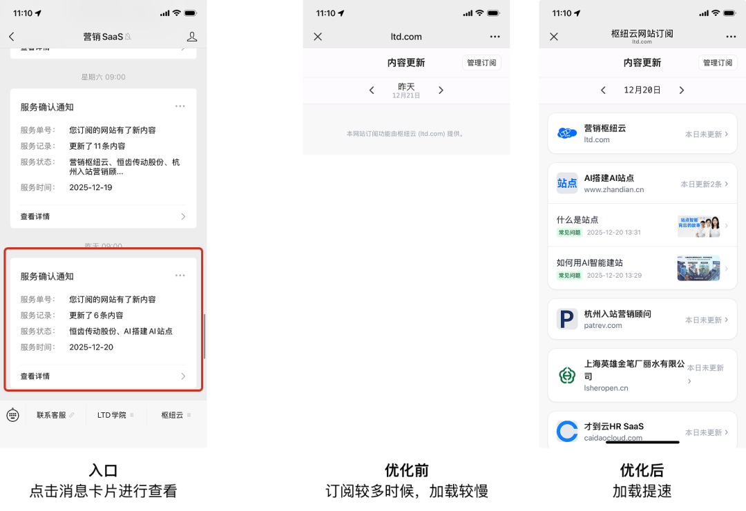 消息推送与功能引导界面: 此截图展示了用户从公众号接收到订阅更新推送的入口界面。顶部状态栏显示“11:10”和“星期六”。页面主体上方显示“营销SaaS”公众号名称。下方展示了两条“服务确认通知”消息卡片,卡片内明确提示“您订阅的网站有了新内容”,并列出了更新的内容数量(如“更新了11条内容”)以及涉及的站点名称(如“营销枢纽云、恒齿传动股份、杭州入站营销顾问...”)。每条卡片都标注了服务时间(如“2025-12-19”)和“查看详情”按钮。页面底部是“联系客服”、“LTD学院”、“枢纽云”三个功能标签页。页面底部中央有明确的文字引导:“入口 点击消息卡片进行查看”。此界面是用户进入订阅聚合页面的主要触发点。