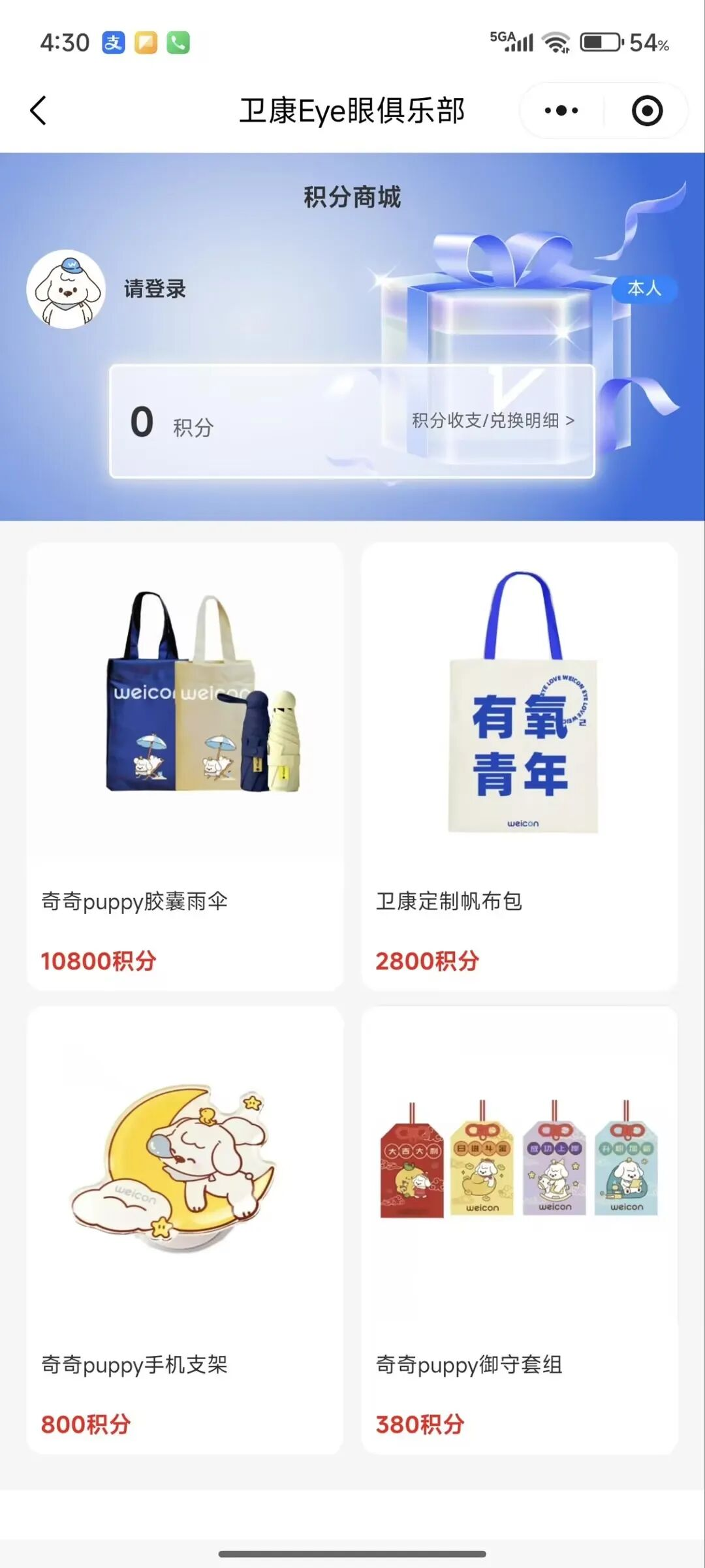 用户视角的积分兑换入口: 此截图展示了“卫康Eye眼俱乐部”积分商城的用户端界面。页面顶部显示俱乐部名称“卫康Eye眼俱乐部”和功能标题“积分商城”,下方是用户登录状态提示“请登录”和当前积分余额“0积分”,并提供“积分收支/兑换明细”的查询入口。页面主体部分展示了4款可用于兑换的商品,布局清晰,每款商品都配有图片、名称和所需的积分价格,例如“奇奇puppy胶囊雨伞”需要“10800积分”,“卫康定制帆布包”需要“2800积分”。对于配置了“纯积分兑换”模式的商品,用户在此界面点击兑换时,若积分不足,将直接提示兑换失败,而不会转入“积分+现金”的支付流程,从而强化了“纯积分”门槛的感知。
