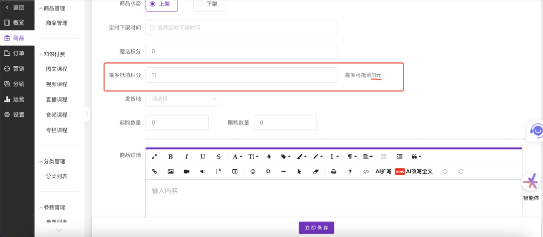 只需在商品编辑后台修改“最多抵消积分”一个字段的数值,即可在“组合兑换”与“纯积分兑换”两种模式间自由切换。这种配置方式非常灵活,运营者可以根据活动节奏、库存情况或营销策略,随时调整特定商品的兑换规则,无需复杂的开发工作,实现了运营策略的快速落地。