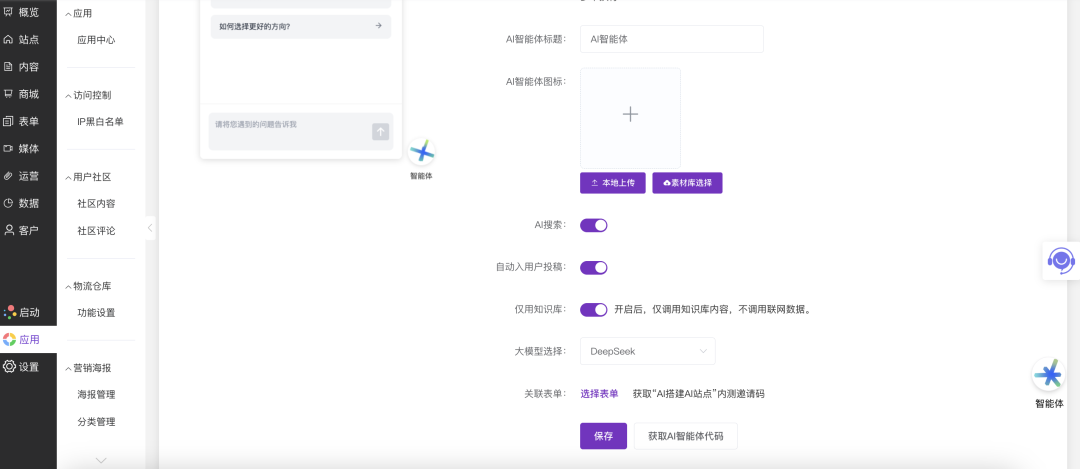 右侧主配置区域包含了智能体的各项设置。在设置了标题、图标、AI搜索、知识库模式和大模型(如DeepSeek)之后,可以找到“关联表单”设置项。如图所示,它是一个下拉选择框,管理员可以点击并从列表中选择一个已创建好的表单,例如图中已选中的“获取‘AI搭建AI站点’内测邀请码”。选择后,点击底部的紫色“保存”按钮,即可完成配置。整个配置过程直观、快捷。