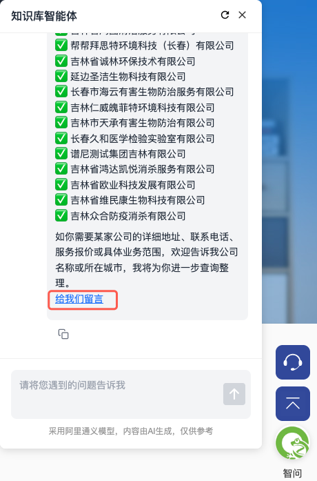 | B2B企业、专业服务机构(如环保、检测、消杀、咨询) | 如截图所示,当用户询问“有哪些消杀公司?”时,AI列出名单后,可顺势引导有具体需求的用户(如需要某公司的地址、电话、报价)通过“留言”入口提交咨询。适用于法律、财税、设计等任何需要客户提交详细需求以获取报价或方案的服务行业。 | 在展示专业能力后,即时转化高意向客户。 在AI提供了有价值的筛选或列表信息后,用户正处于寻求解决方案的主动期。此时出现的表单能将用户的初步兴趣直接转化为可跟进的具体商机,极大缩短销售路径。 |