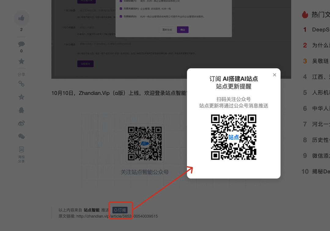 用户点击蓝色的“订阅”按钮。随后,页面中央会弹出一个设计清晰的模态窗口(弹窗)。弹窗顶部标题明确写道“订阅 AI搭建AI站点 站点更新提醒”,直接告知用户订阅的价值。下方提示“扫码关注公众号,站点更新将通过公众号消息推送”。窗口中央醒目地展示该内容来源站点的微信公众号二维码(中间通常有站点Logo)。
