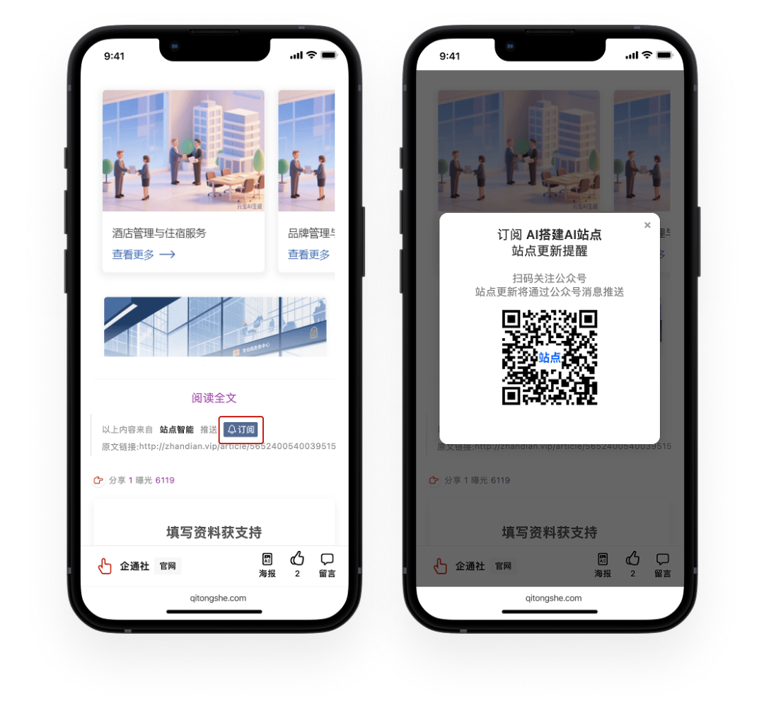 | 所有希望通过内容获取持续流量的网站运营者 | 任何运营内容型站点(如资讯站、博客、垂直社区)的用户,都可以利用此功能。每当站点内容在企通社获得曝光,都能通过底部的订阅按钮,将公域流量引导回自己的私域公众号,实现“一次生产,多渠道引流,持续沉淀”的良性循环。 | 实现公域流量向私域资产的自动化沉淀。 为站外分发的每篇内容都安装了一个“吸粉入口”,让内容推广的价值从单次阅读延伸至长期用户关系维护。 |