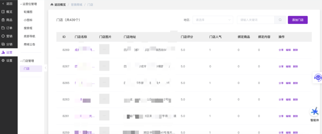 登录后台,进入门店管理列表页,可查看所有门店及其“绑定内容”状态。