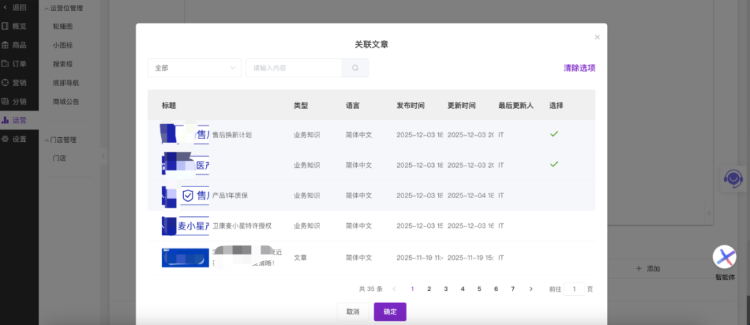 在弹出窗口中使用筛选或搜索功能,勾选需要关联的文章,点击“确定”。