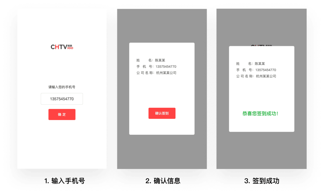 示意图清晰展示了参会者完成签到的三个步骤:1. 在输入框输入手机号并点击“确定”;2. 系统弹出预录信息供确认,点击“确认签到”;3. 显示“恭喜您签到成功!”提示。