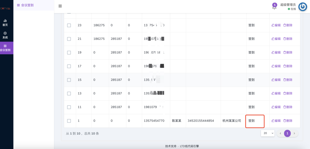 后台管理界面展示所有参会者列表,包含编号、手机号、姓名、公司等信息。已签到人员(如陈某某)的“签到”按钮变为不可操作的灰色状态或“已签到”标记,未签到人员则显示为红色的“签到”按钮,状态一目了然。