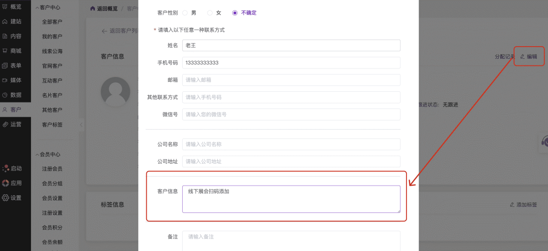 对于“手动添加”类型的客户,在其详情页点击「编辑」。在编辑页面,找到「客户信息」字段(红框标出),即可对之前填写的内容进行修改或补充更详细的跟进情况。