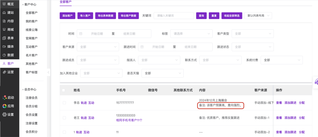 进入「客户中心」-「全部客户」列表。在列表的「内容」列,可直接查看客户的备注信息。如需搜索,在顶部搜索框输入备注中的关键词(如“意向强烈”),点击查询,系统将筛选出所有备注中包含该词的客户。